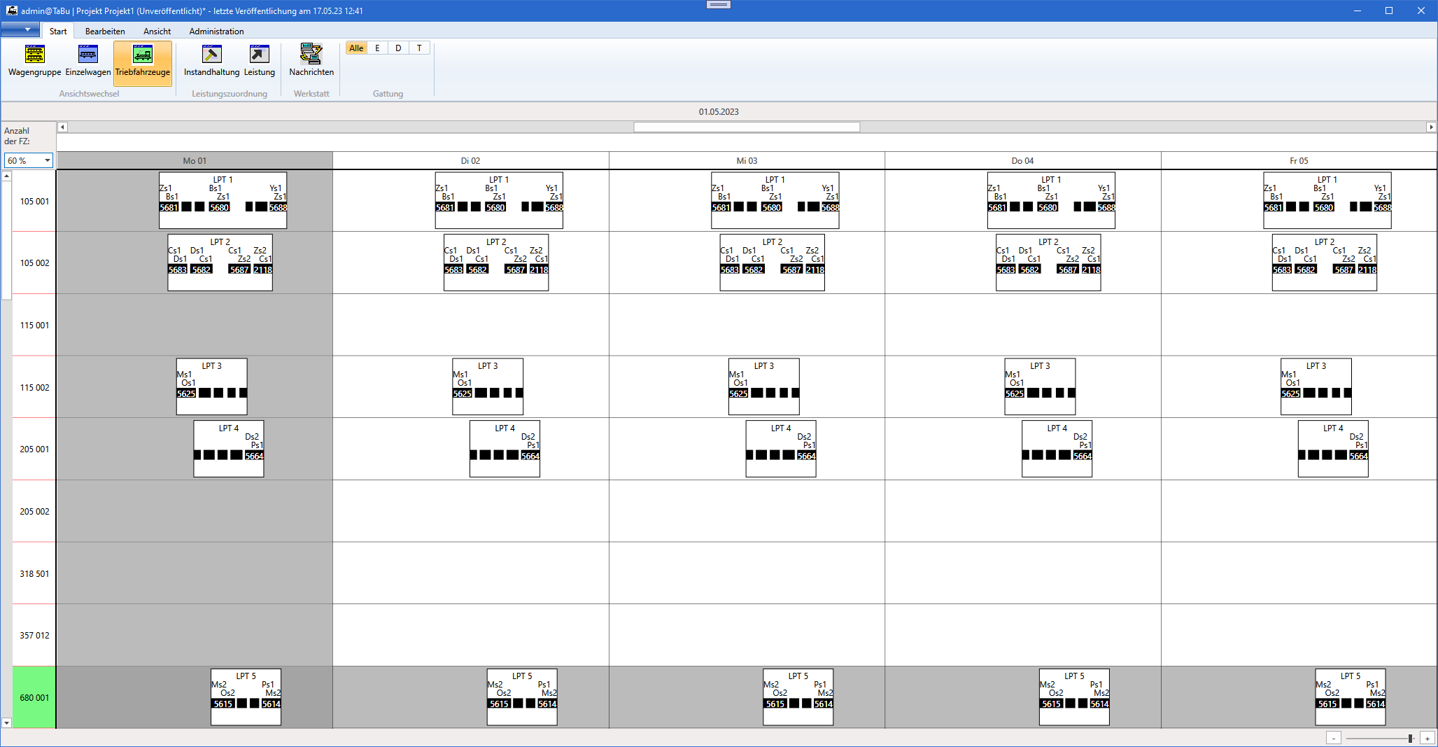 Die Dispositionsansicht der zur Verfügung stehenden Triebfahrzeuge oder Wagen gibt einen zeitlich gestaffelten Überblick zu den aktuell disponierten Leistungen. Per Zoom-In / Zoom-Out bekommt man zum einen detaillierte Tagesansichten oder überblicksartige Mehrmonatsansichten. Zudem lassen sich die Triebfahrzeuge oder Wagen nach Gattungen oder Traktionen gruppieren.